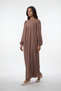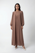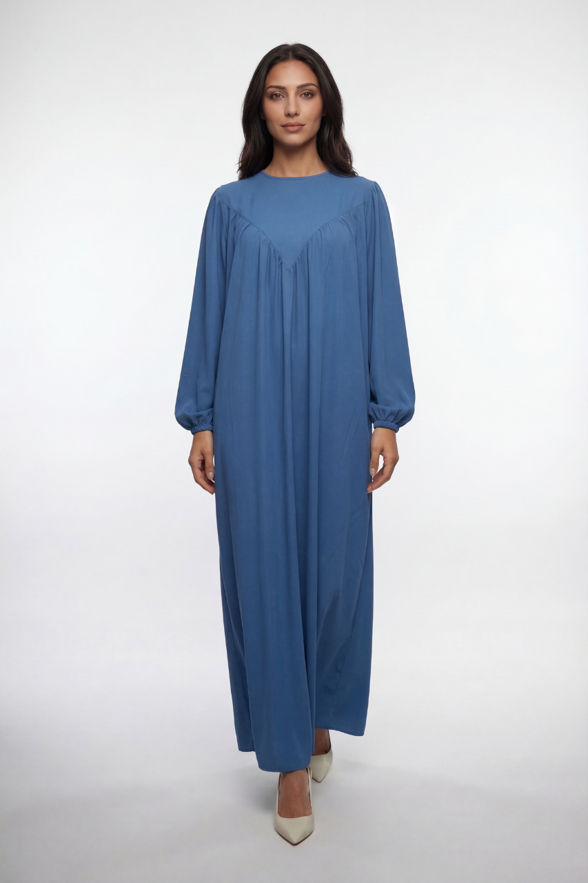Elegante Abaya mit fließendem Schnitt, V-Falten-Design und leichten Ballonärmeln. Bequem, stilvoll und ideal für Alltag & besondere Anlässe.