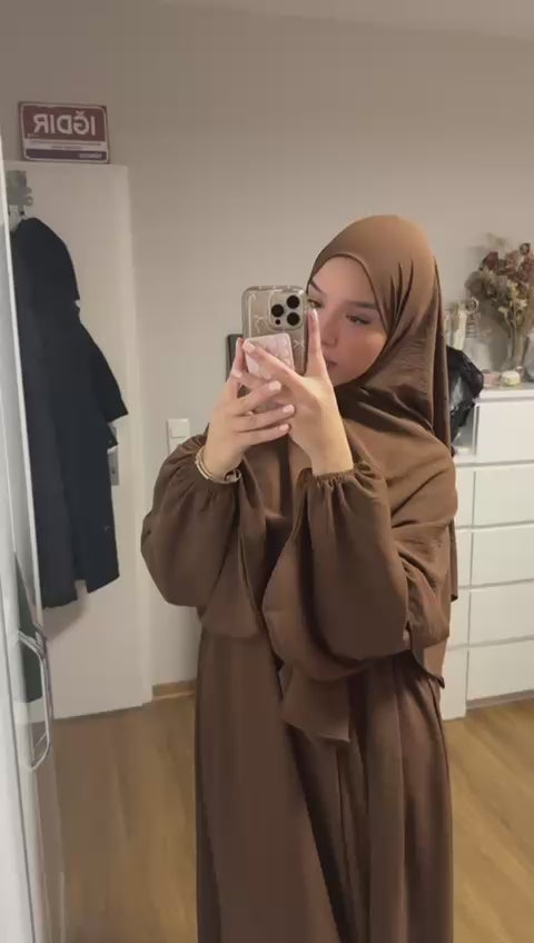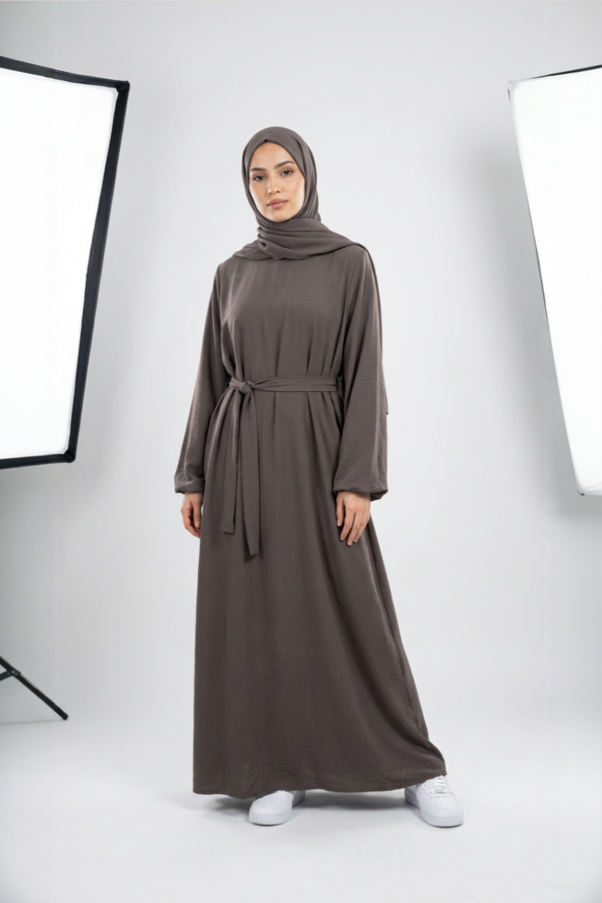 Der fließende Stoff sorgt für eine wunderschöne, elegante Silhouette, während der passende Gürtel dir ermöglicht, den Look individuell zu stylen – locker und modern oder tailliert und feminin. Zusammen mit dem perfekt abgestimmten Hijab entsteht ein harmonisches, stilvolles Gesamtbild, das zeitlose Eleganz ausstrahlt.