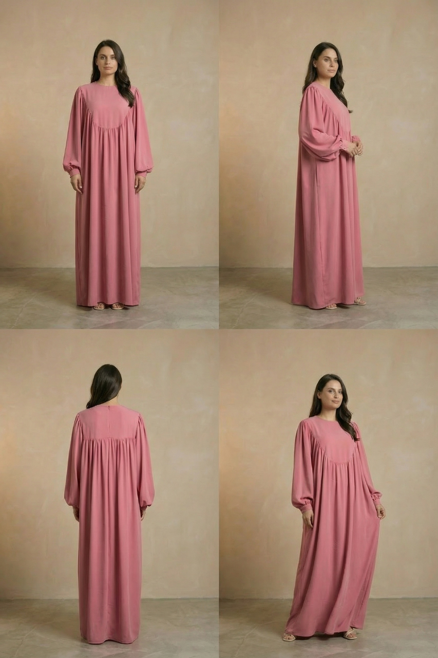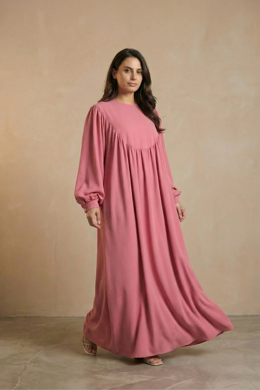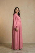 Die Abaya Rose Elegance vereint schlichte Raffinesse mit zeitloser Eleganz. Ihr lockerer Schnitt und die fließenden Stoffbahnen sorgen für höchsten Tragekomfort, während die Ballonärmel einen femininen Akzent setzen. In dem warmen Roséton ist dieses Kleid ideal für festliche Anlässe oder stilvolle Alltagslooks.
