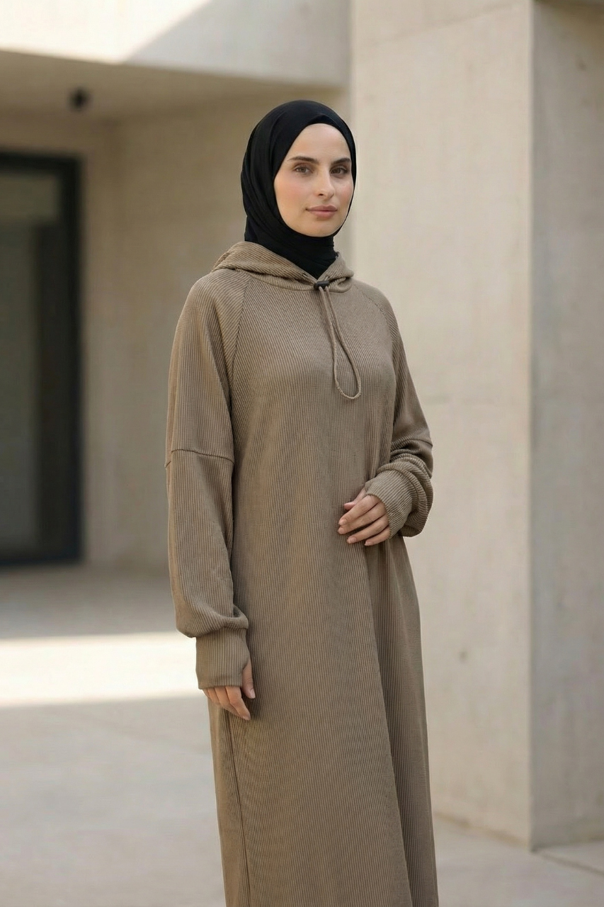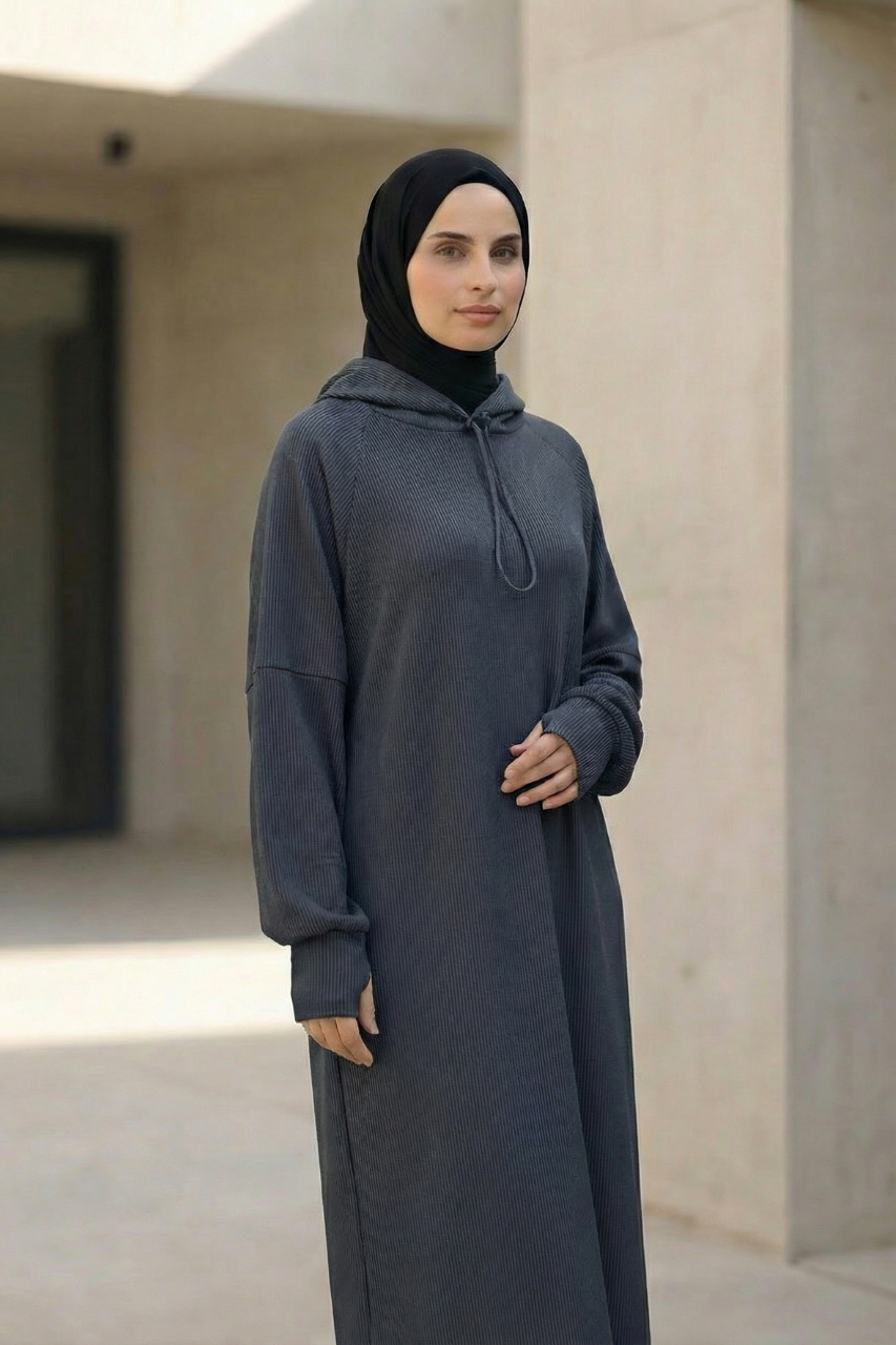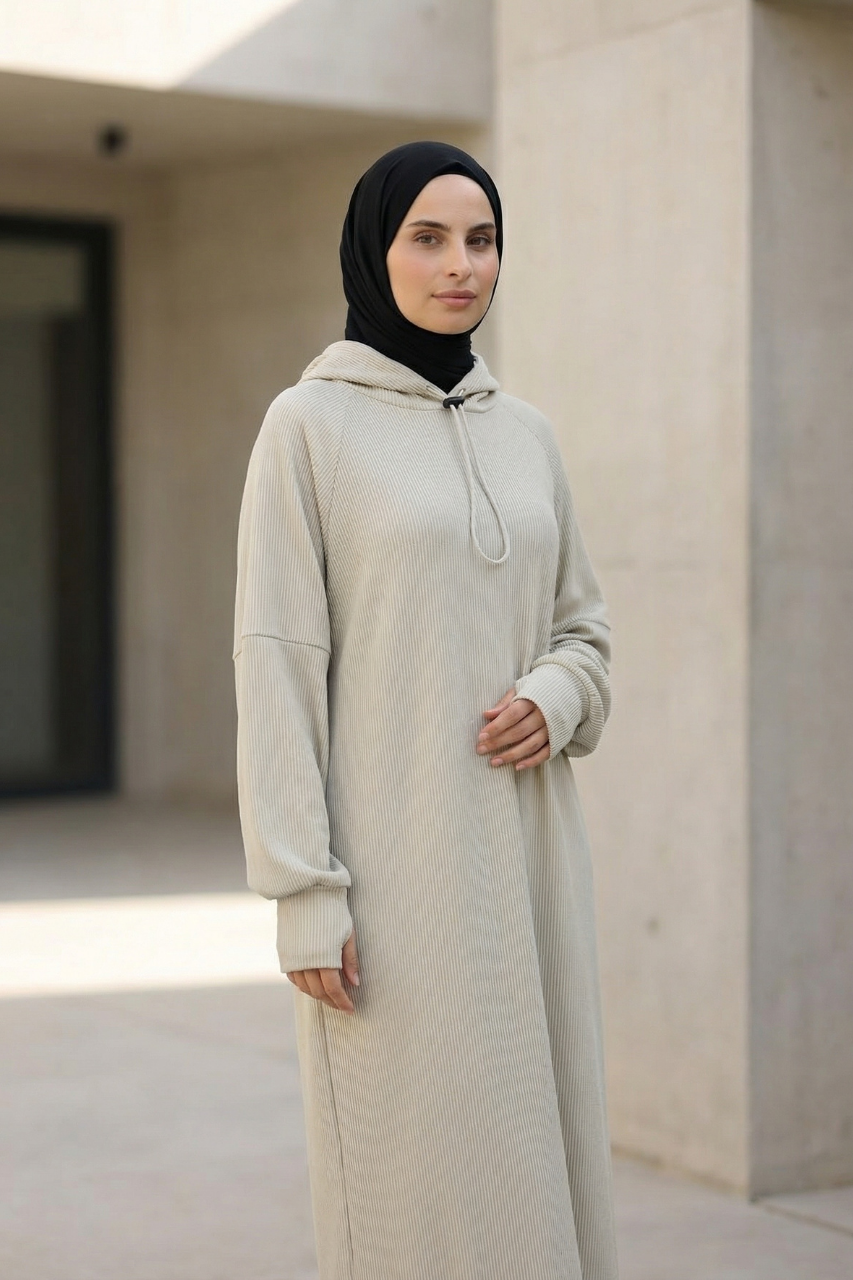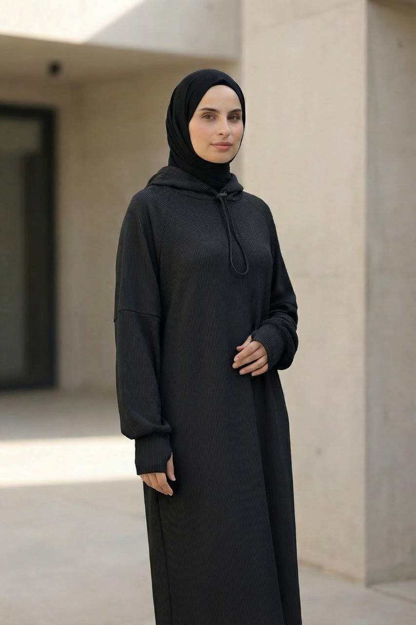 Die integrierte Kapuze verleiht dem Kleid einen sportlich-urbanen Touch und macht den Look zugleich modern und vielseitig kombinierbar. Ein besonderes Highlight sind die verlängerten Ärmel, die sich bei Bedarf einfach über die Hände ziehen lassen. Das bietet nicht nur zusätzliche Wärme, sondern kreiert auch einen coolen, trendbewussten Style, der sich perfekt in aktuelle Fashion-Trends einfügt.