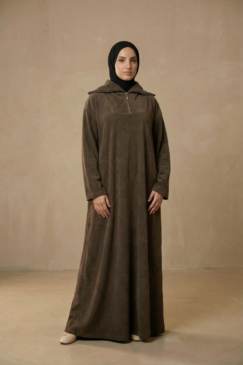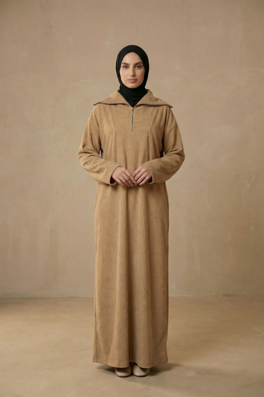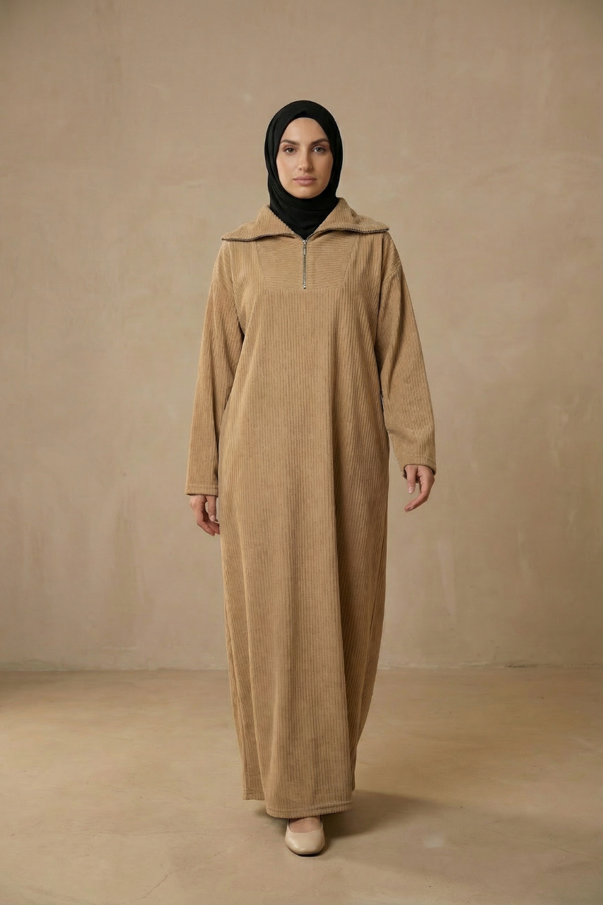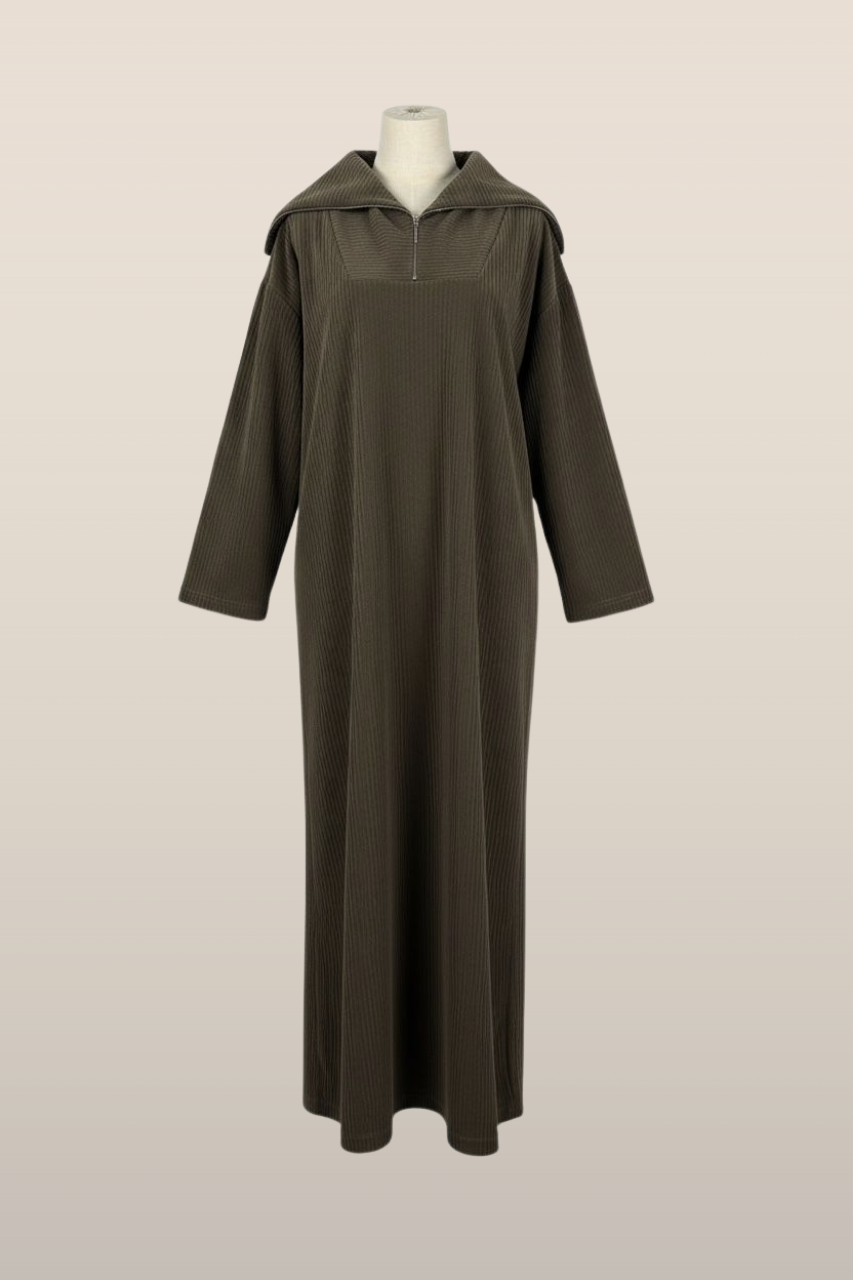 Langes weiches Rippensamtkleid mit hochstehendem Kragen und Reißverschluss. Mit Gurt an der Taille kombinierbar. Dieses kuschelige Kleid ist genau passend zu kalter Jahreszeit.