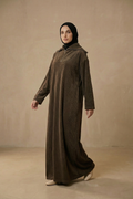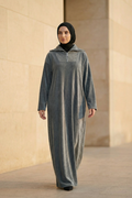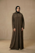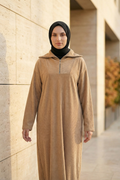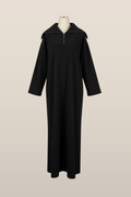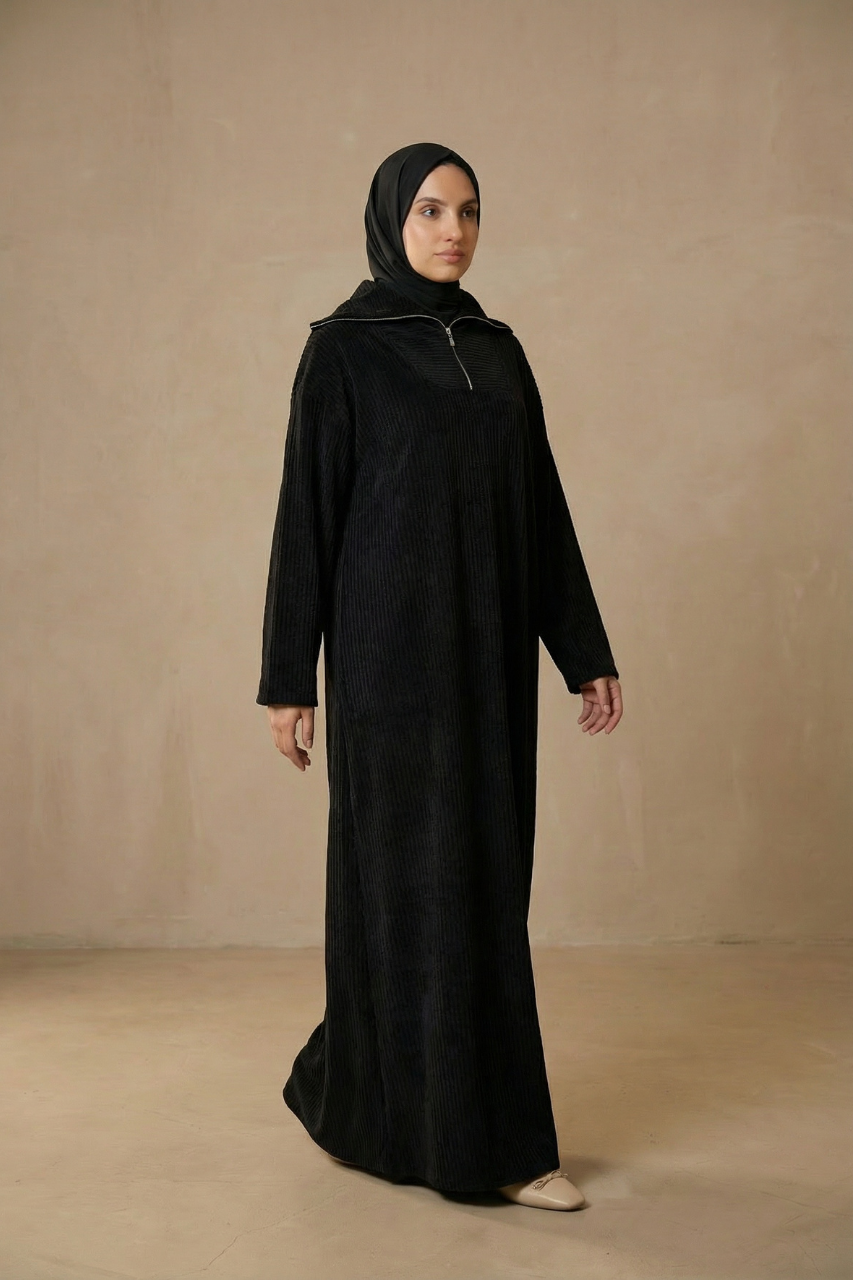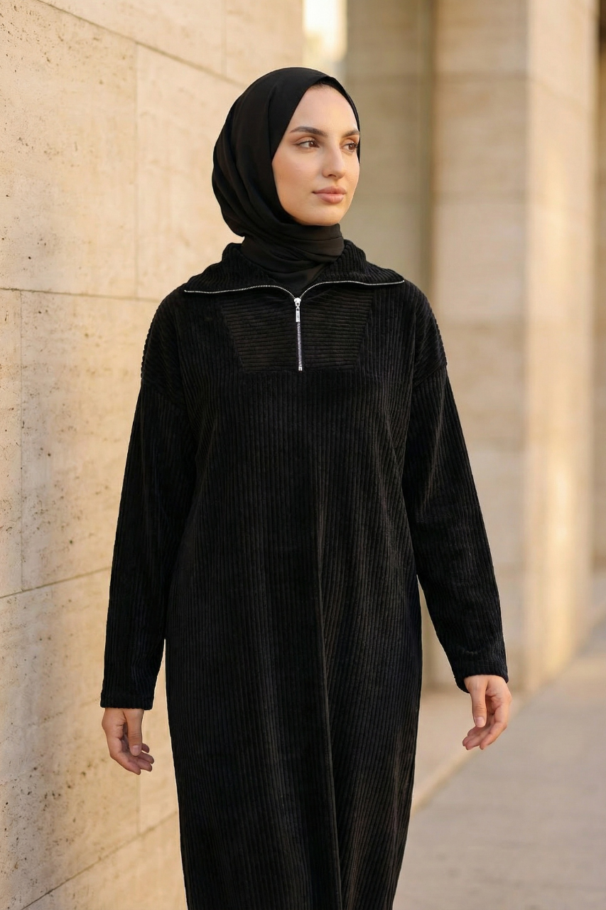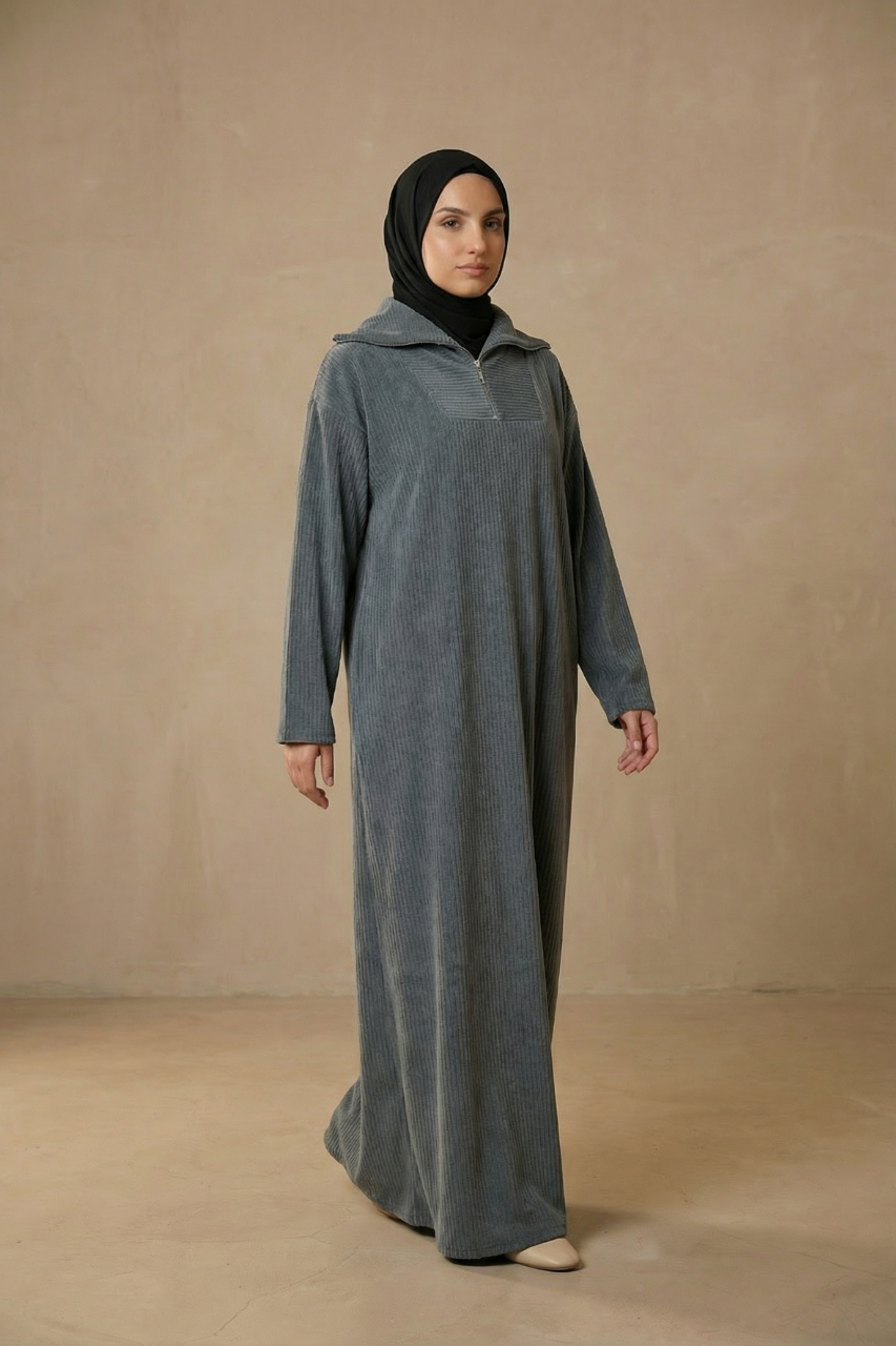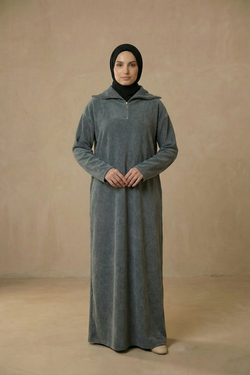 Langes weiches Rippensamtkleid mit hochstehendem Kragen und Reißverschluss. Mit Gurt an der Taille kombinierbar. Dieses kuschelige Kleid ist genau passend zu kalter Jahreszeit.